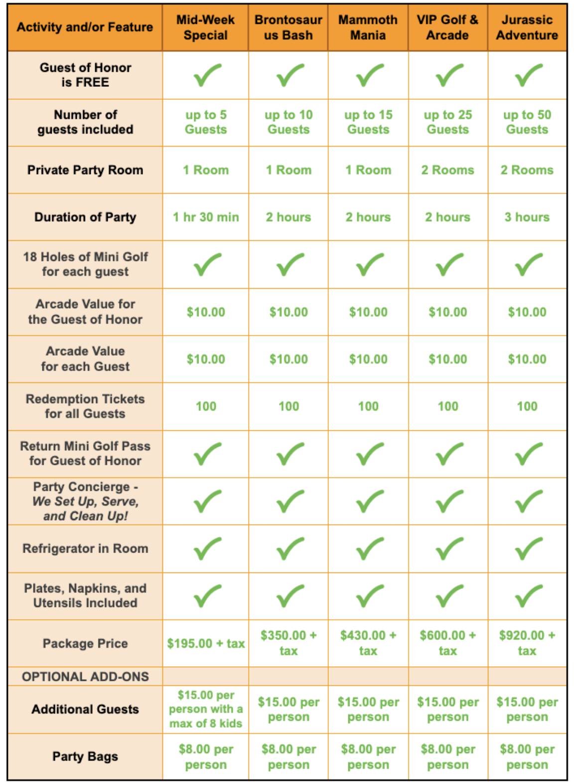 Typical party flow includes 1 hour in Party Room, followed by Golf and finishing in the Arcade (2-hour party)